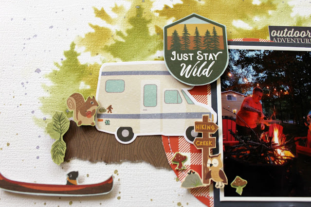 I was inspired by the colors and camping theme. For evidence, I used: plaid, woodgrain pattern, camping themed items, wood, watercolor, bird, animal, trees, leaves, camper, boat, signs, lantern, clouds and cursive font.
